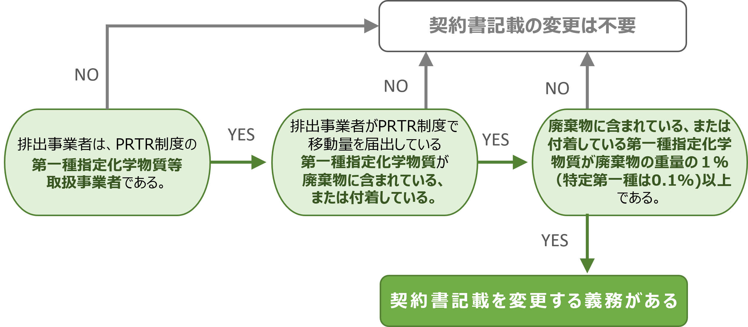 全ての事業者、委託する全ての廃棄物が本改正の対象ということではありません。下図の3つの要件を満たす場合のみが対象です。化学物質排出把握管理促進法に基づくPRTR制度の対象でない排出事業者は、現行の産業廃棄物処理委託契約書の記載を変更する必要はありません。