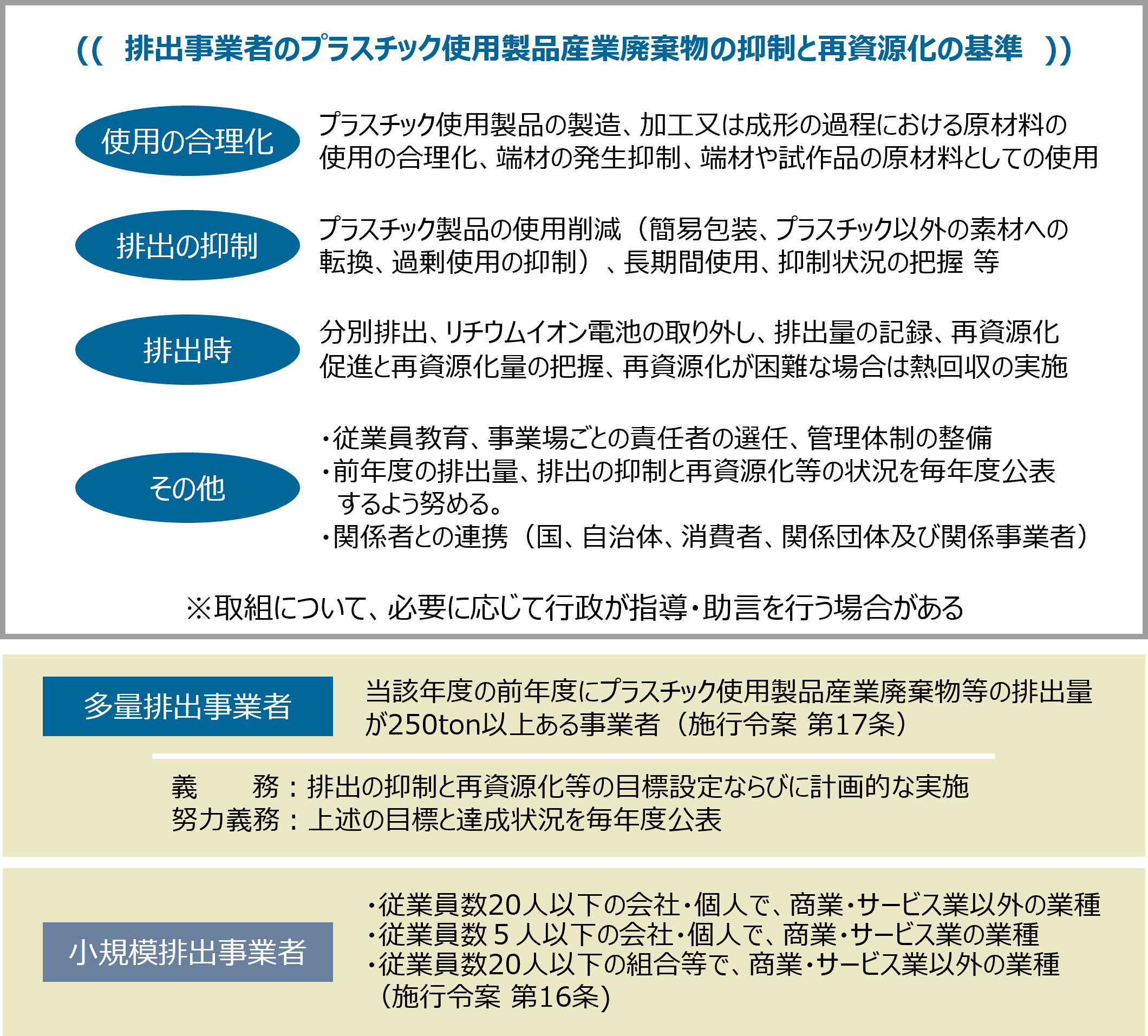 プラスチック使用製品を産業廃棄物として排出する事業者は、プラスチック新法に定めた基準(下図)にもとづいて、プラスチックごみの排出抑制や再資源化に取り組むことが求められます。また、前年度の排出量、排出の抑制と再資源化等の目標、達成状況の公表が努力義務になります。