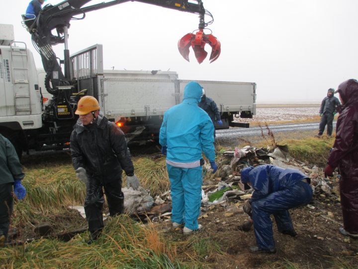 中には重くて大きな廃棄物もあるため、重機を使ってトラックに積み込み回収しました。