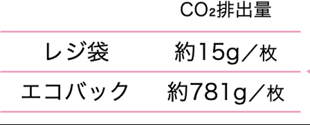 プラスチック製のエコバックの生産から廃棄までに出るCO₂排出量は、レジ袋52枚分に相当し、長く使うほど環境にやさしくなります。