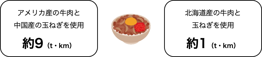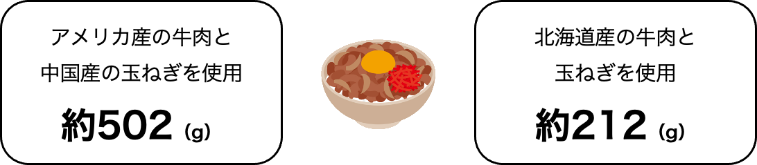 例えば、家族4人で牛丼を食べたとします。牛丼に使った食材が外国産の場合と国産の場合で、フードマイレージはどれくらい違うのでしょうか。
