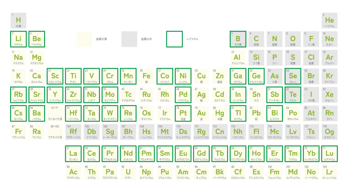 ※レアメタルのうち、21スカンジウム、39イットリウム、57ランタン~71ルテチウムまでの17元素は、まとめて「レアアース(希土類)」と呼ばれています。レシピではレアアースの17元素を1種類として数えています。