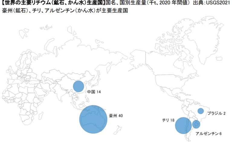高度な製品づくりに欠かせないレアメタルですが、実はどの国でも取れるわけではなく、産出国が限られています。例えば、レアメタルの1つのリチウムの世界の生産量を見ると、全体の49%がオーストラリア、22%がチリ、17%が中国であり、3か国で約9割を占めています。日本は残念ながらほぼすべてを海外から輸入しています。