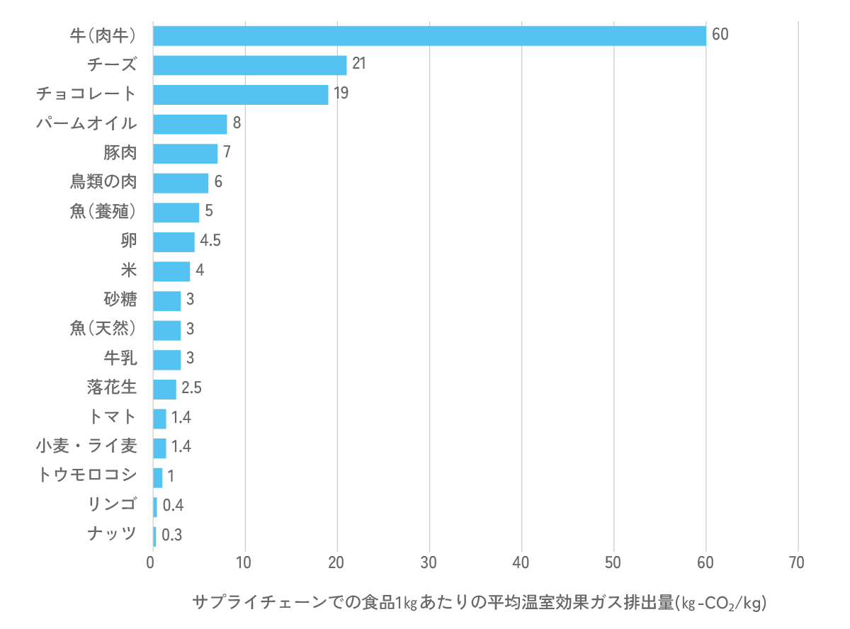 各食品のサプライチェーン(製品の原材料・部品の調達から製造、販売までの一連の流れ)での温室効果ガスの排出量を見てみましょう。