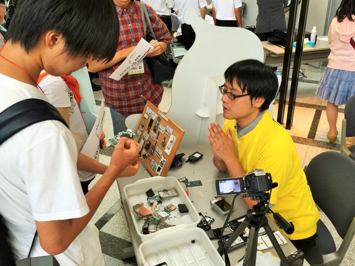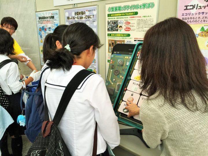 授業はサスティナビリティ・ソリューション部の浦出陽子部長が行い、『都市鉱山から金属を再生! リサイクル最前線での挑戦』と題して、都市鉱山の重要性と課題についてお話をしました。あまり目にすることがない資料や写真に高校生たちは真剣に聞き入っていました。一方、ブースでは、実際に携帯電話の解体をライブで行ったり、エコリュックサック、アンケートの実施等を行い、1時間弱の実施時間にも限らず、200人以上の生徒が訪れました。高校生の皆さんから頂いたアンケートはまた別の機会にご紹介ができればと考えています。