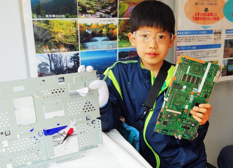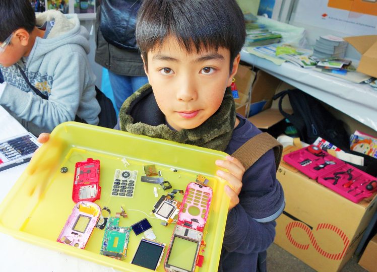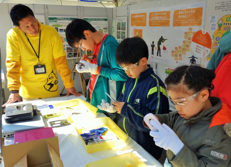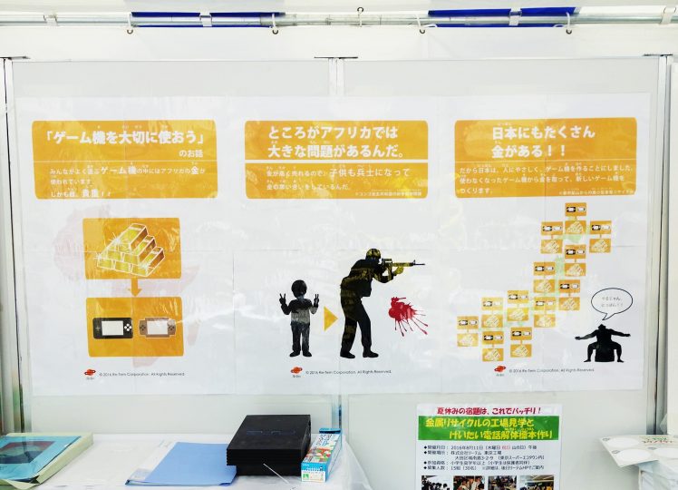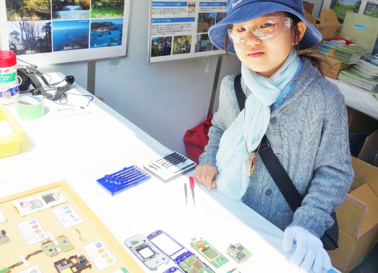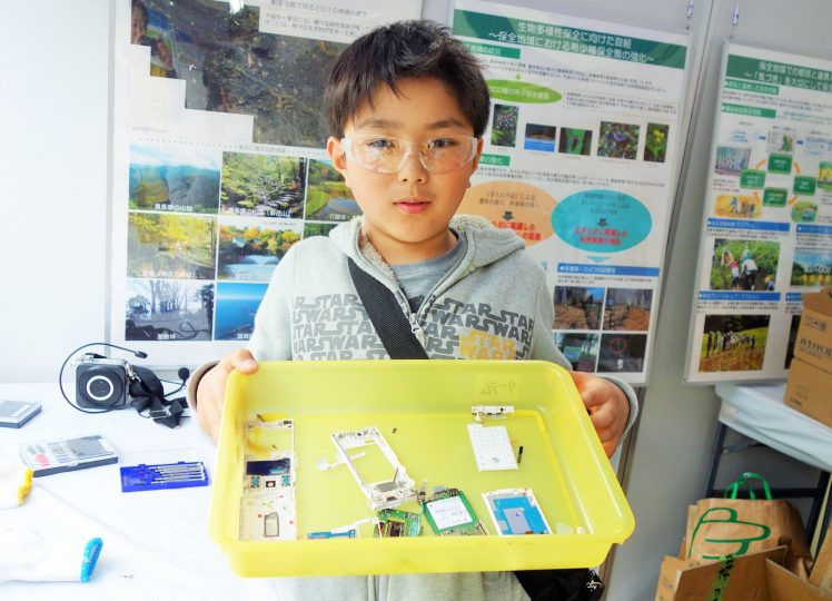 リーテムでは、電子電気機器に使用されている金属資源の中にアフリカから輸入されている資源があること、採掘国では部族同士の争いや環境破壊や不正な取引が行われていることを知っていただき、資源の大切さやリサイクルの重要性をご理解いただくために、パソコンや携帯電話の解体ショーを行いました。興味深く見つめる子どもたちや昔懐かしいゲーム機に興奮する大人の方々、中には、動物園に来たのに動物を全く見ないで、ずっと携帯電話を解体しているお子さまもいて、改めて関心の深さを実感しました。