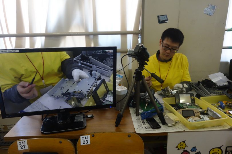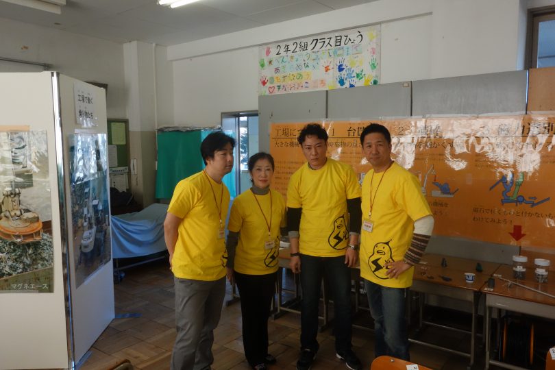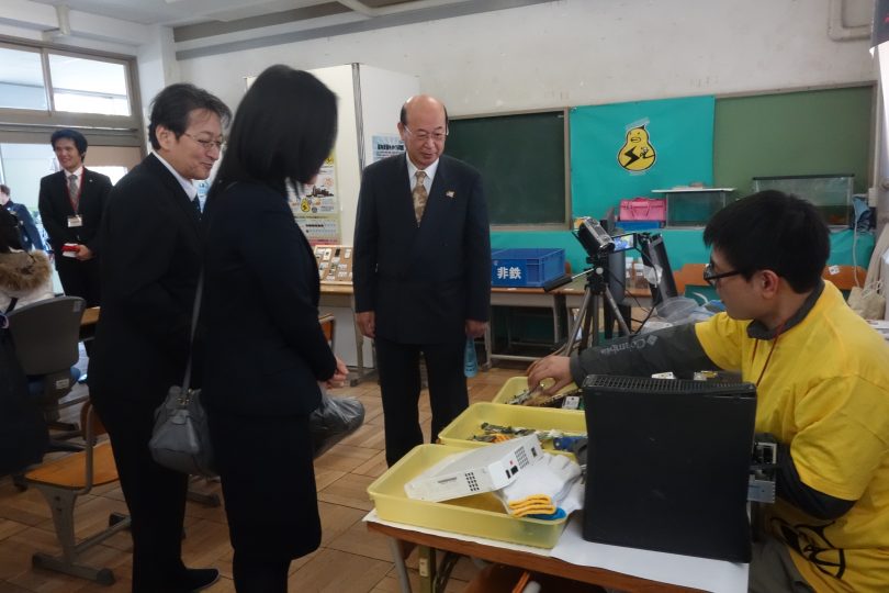 当日は大田区立高畑小学校の2年2組の教室をお借りして、金属リサイクル処理の流れをミニチュア版で紹介したり、電子機器類の解体ショーや小型家電リサイクルについて説明を行いました。
